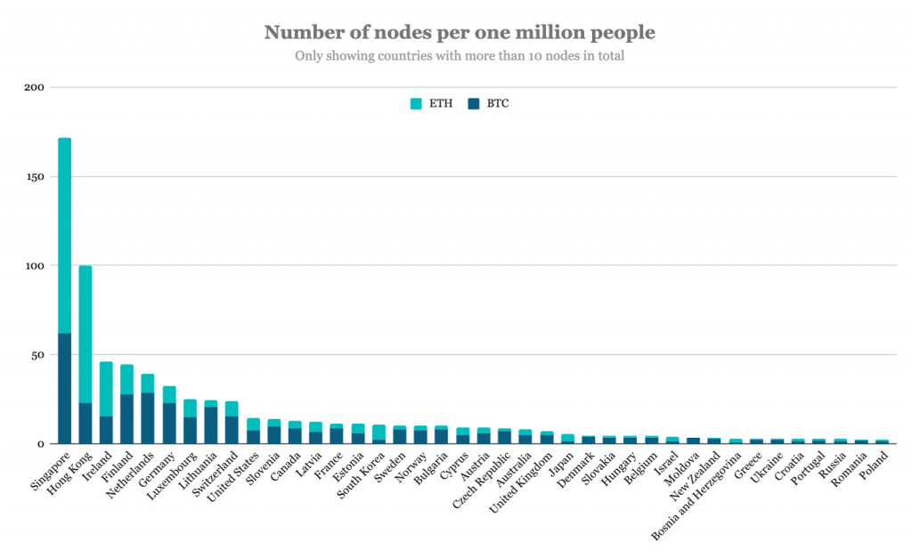 По данным The Block, Сингапур лидирует по числу нод биткоина и Ethereum на 1 млн населения: