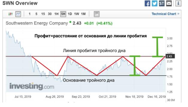 Мы наблюдаем сформированную фигуру «Тройное дно» очень схожа с фигурой «Двойное дно», но отличается от нее тем, что у тройного дна добавляется еще один минимум. Тройное дно образовывается после нисходящего тренда, и предшествует восходящему: тройное дно разворачивает цену вверх.