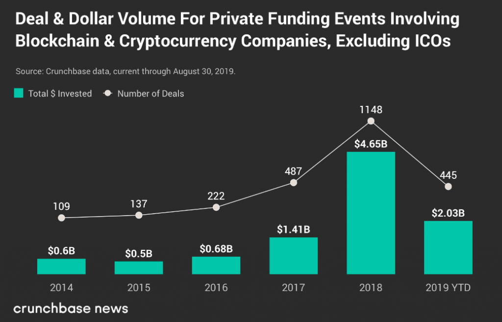 По данным Crunchbase, это меньше, чем годом ранее, когда в общей сложности было заключено 1148 сделок на общую сумму в $4,65 млрд, однако больше, чем в 2017 году, когда объем венчурного финансирования блокчейн-индустрии составил $1,41 млрд.