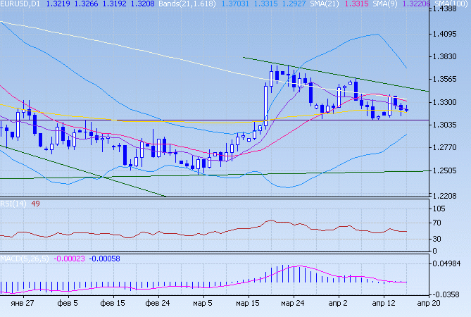 Активность игроков низкая, вялая торговля без определенного направления. Евро не сумел ранее вырасти, но снижения также не последовало. Торговля ведется в середине сужающегося треугольника, прорыв треугольника обозначит направление дальнейшего движения. Ожидаем роста евро после периода консолидации. Не исключено снижение к поддержке треугольника. Прорыв сопротивления треугольника и особенно отметки 1,3740 станет важным сигналом усиления повышательного тренда. Ближайшее сопротивление расположено на 1,3270/1,3315. Сильная поддержка проходит по 1,3090/60.