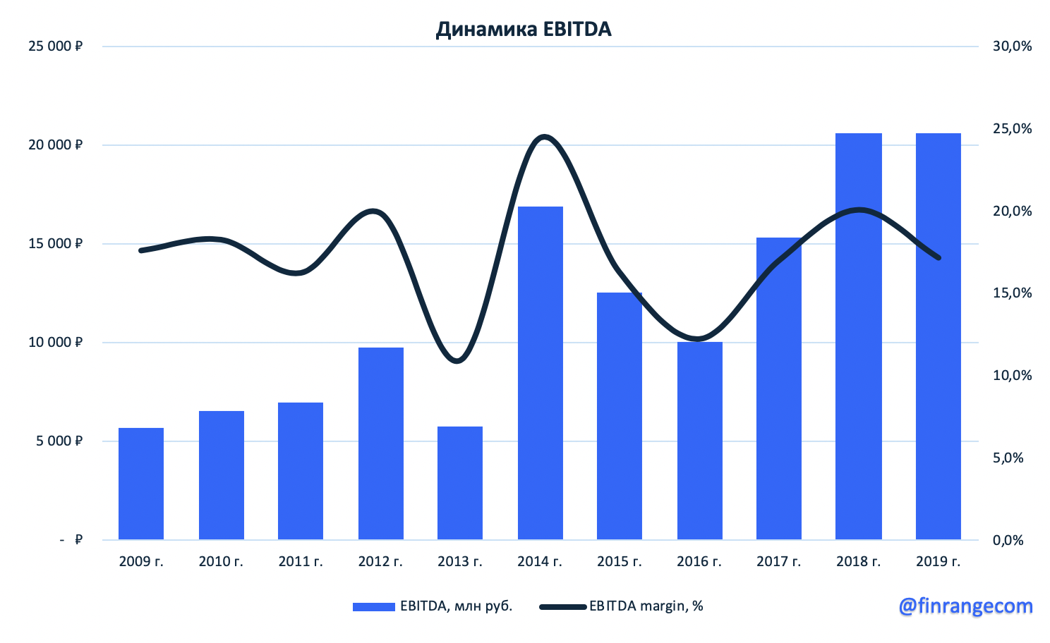 Показатель EBITDA остался на уровне значения 2018 г. и составила 20,6 млрд руб., рентабельность по EBITDA снизилась до 17,2% против 20,3% в 2018 г.