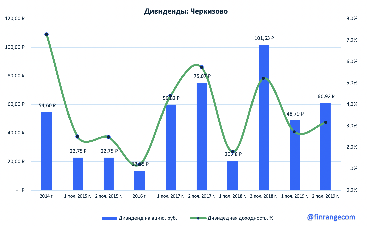 Согласно дивидендной политике компании, на выплату дивидендов направляется не менее 50% прибыли по МСФО, при показателе net debt/EBITDA меньше 2,5х в среднесрочной перспективе. Совет директоров Черкизово рекомендовал дивиденды за II пол. 2019 г. в размере 60,92 руб. Таким образом, выплаты по итогам II пол. 2019 г. могут составить 2,68 млрд руб. Текущая дивидендная доходность составляет 3%. Закрытие реестра состоится 7 апреля 2020 г.