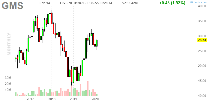 GMS (NYSE: GMS) - группа компаний, поставляющая строительные материалы. Компания предлагает широкий ассортимент того, что необходимо для строительства жилых и коммерческих зданий, ремонта и отделочный работ.