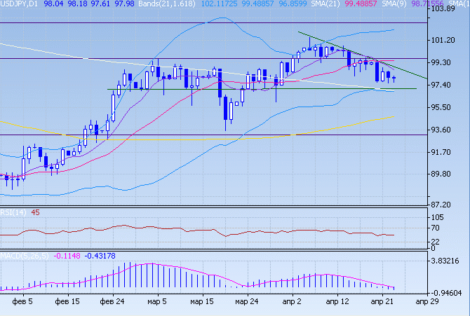 Доллар нашел промежуточную поддержку на отметке 97,70. Наблюдаем пересечение 9-дневной и 21-дневной скользящих средних в сторону роста Йены, что оказывает на доллар давление. Сопротивление доллару оказывает область 98,60-80. Ситуация совершенно нейтральна, вероятно развитие событий в любом из направлений.