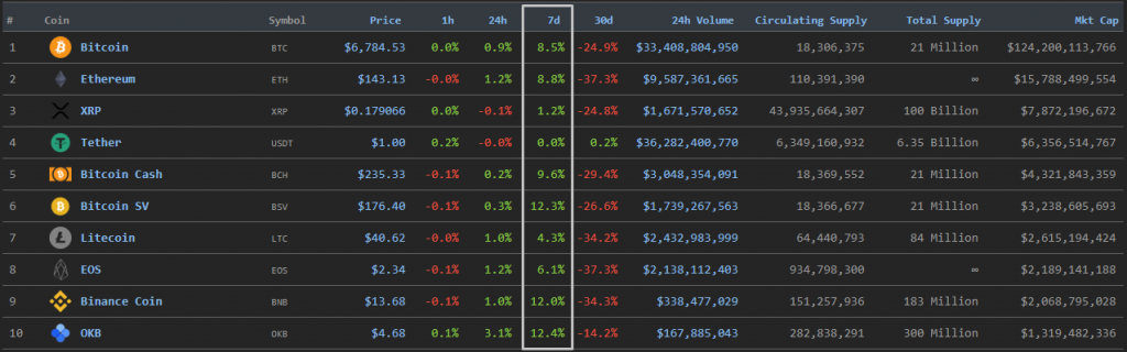Как можно заметить, за неделю ни один из этих активов не подешевел. Быстрее всех за последние семь дней росли Bitcoin SV, Binance Coin и токен OKB биржи OKEx.
