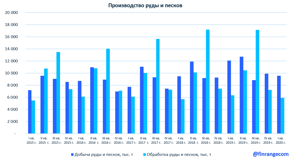 А вот добыча руды и песков за I кв. 2020 г. упала на 21% по сравнению с I кв. 2019 г. – до 9,5 тыс. тонн, что в свою очередь привело к снижению обработки руды и песков, а также к росту запасов на 2% – до 30,2 млн тонн.