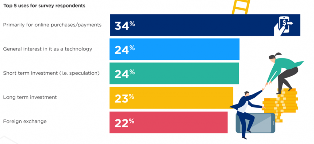 В большинстве случаев (34%) криптовалюты используются для онлайн-платежей, в 24% основной интерес их владельцев вызывает сама технология, еще 24% рассматривает их в качестве краткосрочной инвестиции, 23% — в качестве долгосрочной.