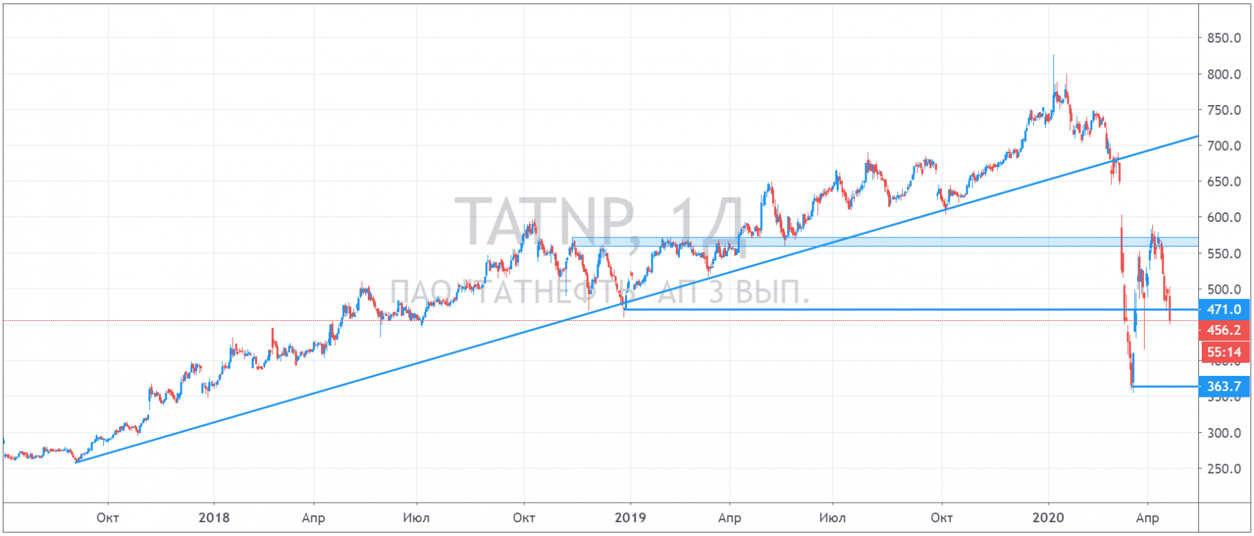 Первой нефтегазовой компанией, которая отменила дивиденды стала Татнефть. Сегодня совет директоров компании принял решение отменить финальные дивиденды за 2019 г. на обыкновенные акции и рекомендовал всего 1 руб. на привилегированные акции. Текущая дивидендная доходность составляет 0,2%. На фоне этого акции падают более чем на 7%.