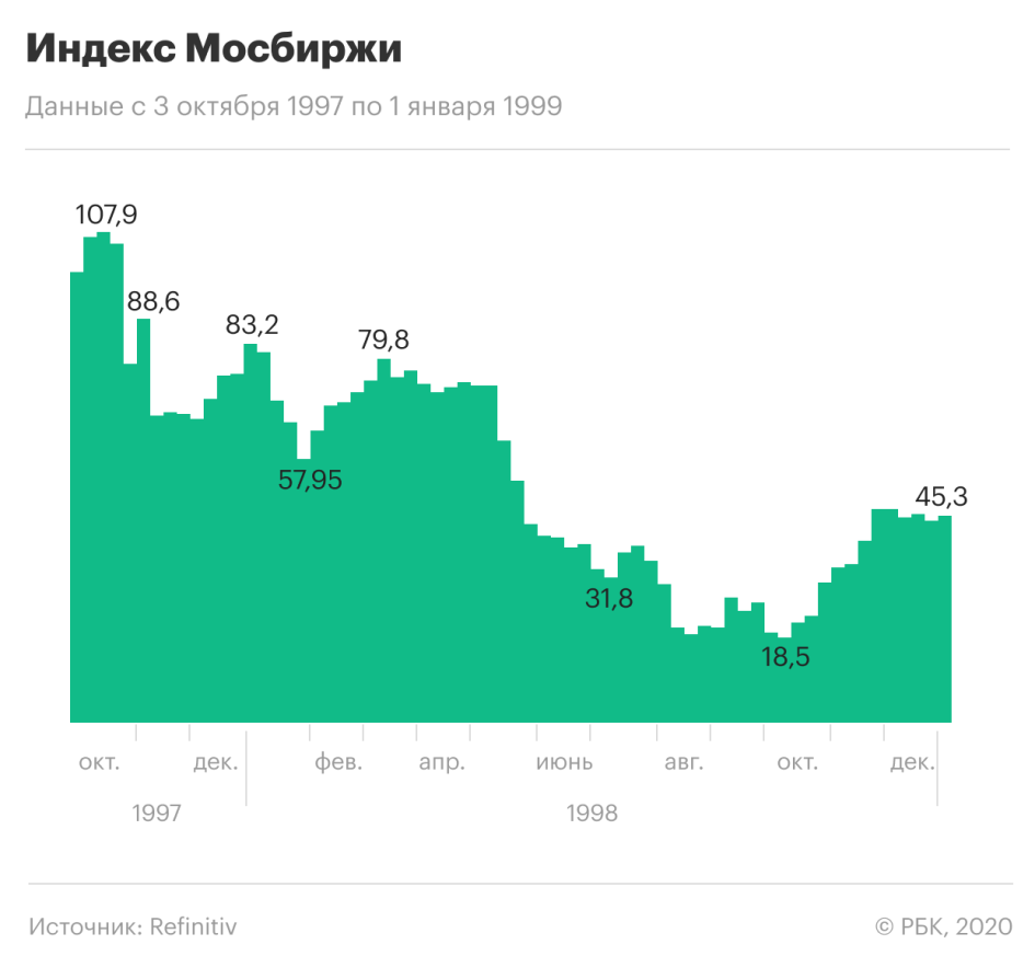 Индекс Мосбиржи во время экономического кризиса в России в 1997-1998 годах двигался примерно по такой же схеме. Рынок достиг второго дна спустя два месяца, третьего дна — спустя пять месяцев.