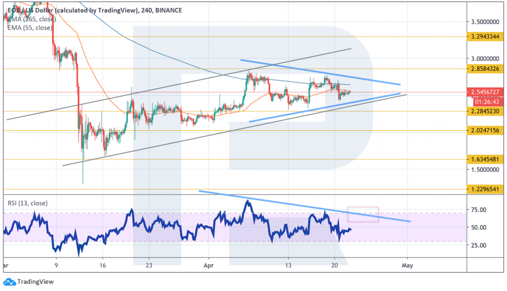 На более мелких временных промежутках цена «зажата» в рамках модели «Треугольник». В случае пробоя нижней границы модели и закрепления котировок под уровнем $2.28 стоит ожидать начала падения стоимости актива к первой цели на уровне $2.02. Дополнительным сигналом в пользу такого сценария выступит отскок от линии тренда на индикаторе RSI. Отменой этого варианта может стать пробой верхней границы модели «Треугольник» с закреплением цены над уровнем $2.85, где целью подъема выступит область около уровня $3.29.