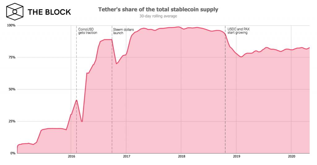 Занимаемая Tether доля на рынке стейблкоинов. Данные: Coin Metrics, Etherscan, The Block Research