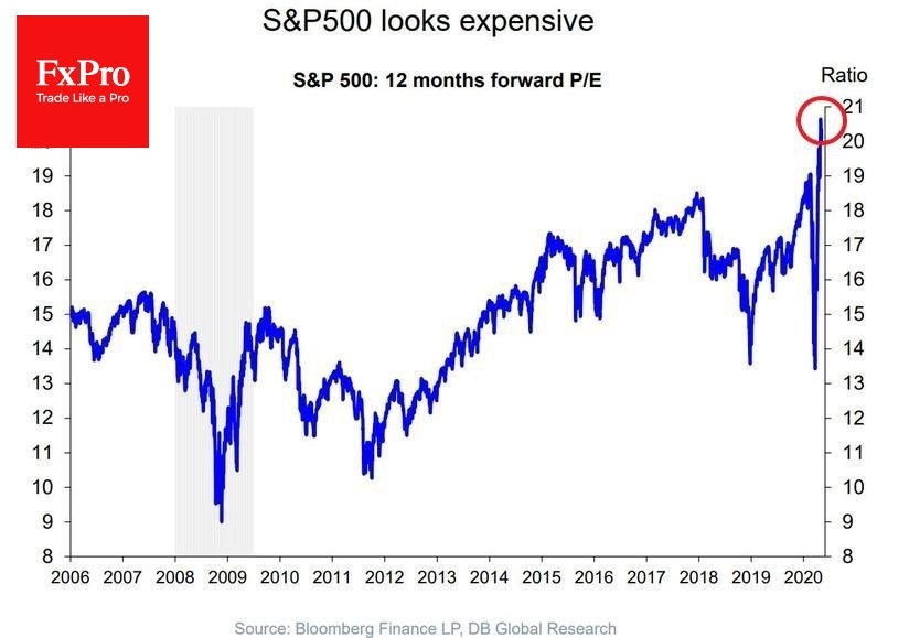 В то же время, на фондовых рынках ситуация иная. Акции американских компаний отыграли значительную часть своего снижения в феврале-марте. NASDAQ и вовсе в плюсе к уровню на начало года. С другой стороны, сейчас сокращаются прогнозы по дивидендам и выручке. Соотношение P/E на ближайшие 12 месяцев обновило максимумы, которые рынки видели в начале года на пике динамики индексов.