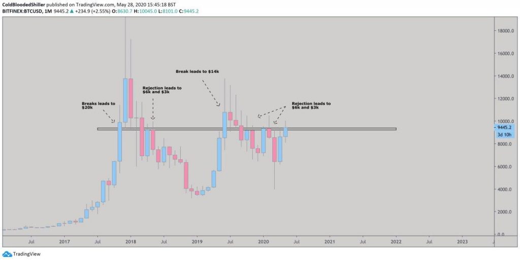 Аналитик ColdBloodShill обратил внимание на важность закрепления над уровнем $9360 для будущих перспектив цены биткоина. С другой стороны, он указал на высокие шансы отката к $6000 и даже к $3000, если цена провалится ниже этой отметки.