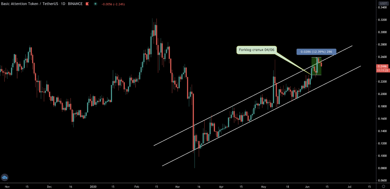Вернемся к криптовалюте BAT. В прошлом аналитическом обзоре я указал на рост пары BAT/USDT, несмотря на краткосрочное падение BTC. BAT все также продолжает демонстрировать рост (+12.39% с 4 июня), несмотря на волатильность биткоина. Сейчас по этой криптовалютной паре возможен откат до нижней границы восходящего канала. Однако если биткоин все же пробьет $10 000, надо полагать, что BAT и многие другие криптовалюты последуют за этим ростом.