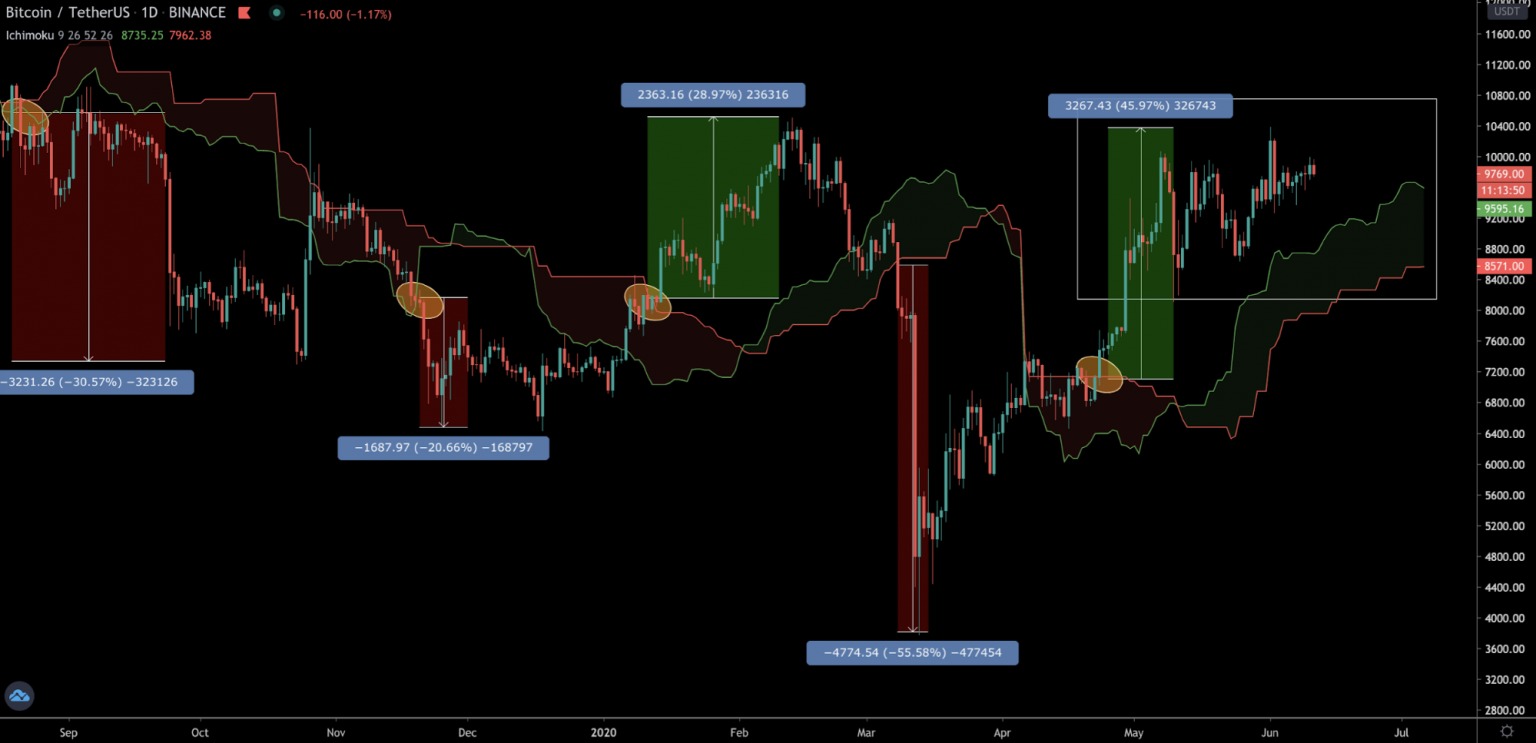Одним из эффективных технических индикаторов на криптовалютном рынке является Облако Ишимоку (Ichimoku cloud). На графике ниже я отобразил отработку данного индикатора, где оранжевыми кругами выделены зоны пробоя «облака». Сейчас цена находится над «облаком», что говорит нам о силе восходящего тренда.