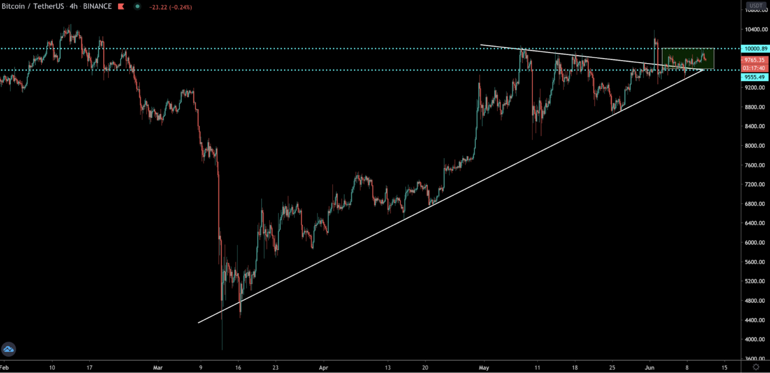 Напомню, что 7 мая и 1 июня биткоин уже пытался пробить уровень $10 000, но так и не смог закрепиться на новом рубеже. Именно поэтому сейчас важно набраться терпения и ждать правильного момента для входа в рынок.