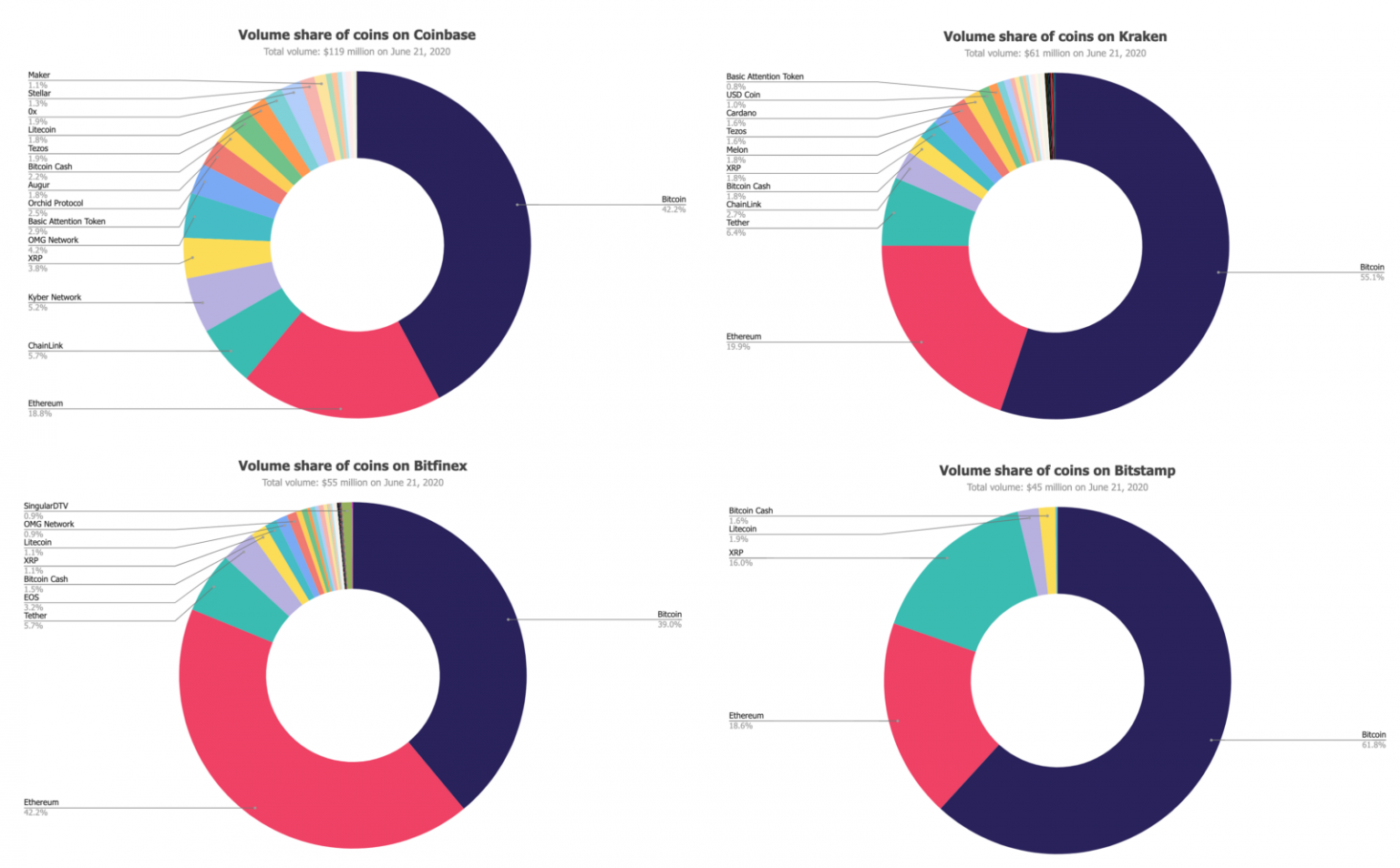 Исторически наиболее ликвидные торговые пары BTC/USD на четырех биржах — Bitfinex, Coinbase, Kraken, и Bitstamp.