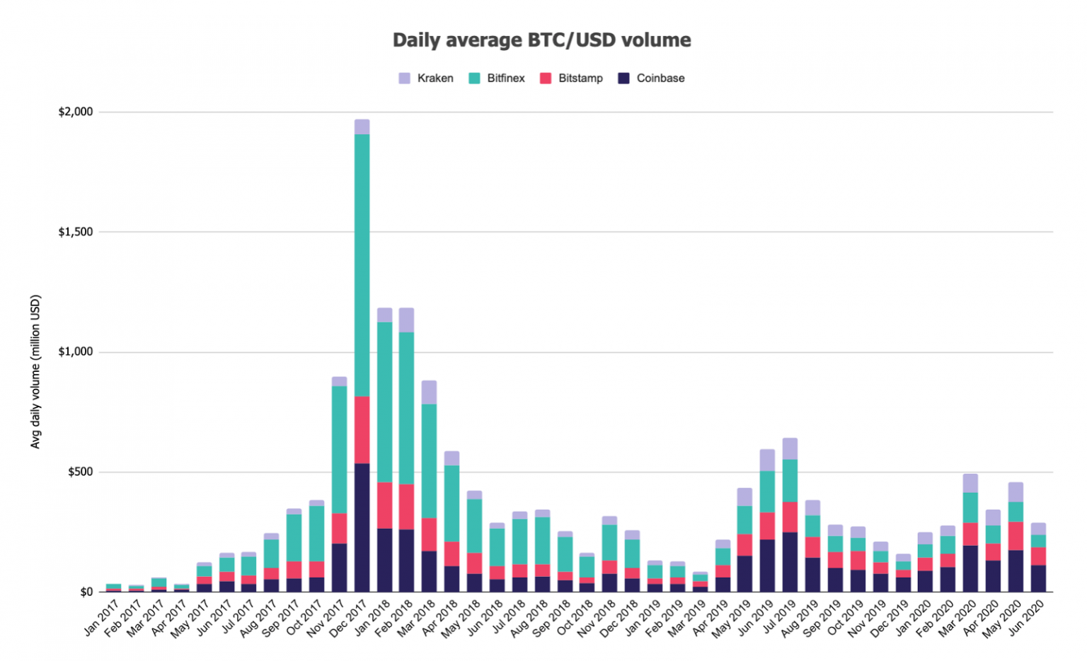 В марте 2020 года суточные обороты в паре BTC/USD на вышеперечисленных биржах достигли $492 млн. К июню показатель упал до $291,3 млн, что на 36% меньше, чем в мае.
