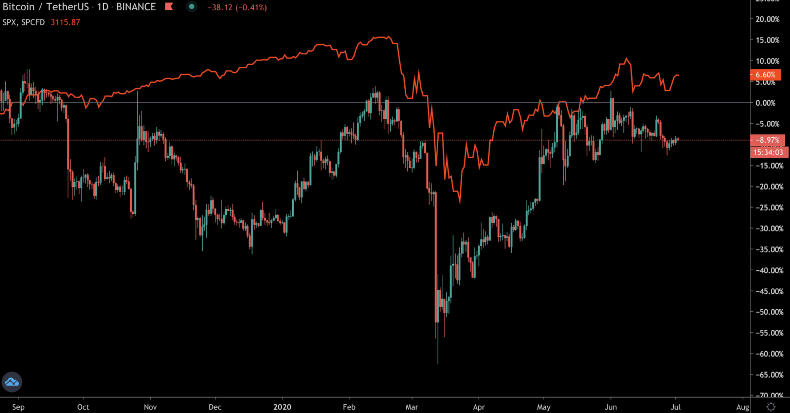 Напомню, что с начала пандемии коронавируса BTC имеет высокую корреляцию с традиционным рынком, представителем которого на графике является индекс S&P 500. Думаю, такая тенденция еще будет сохраняться какое-то время. Если ситуация с пандемией ухудшится и во многих странах, где принимают карантинные послабления, начнется вторая волна, то вполне вероятно падение рынков. Фундаментально, пандемия является сейчас ключевым двигателем инвестиционного настроения.