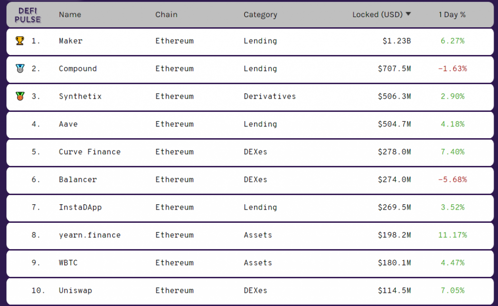 Следом идут Compound и Synthetix – $707,5 млн и $506,3 млн. На пятки Synthetix наступает Aave — $504,7 млн.