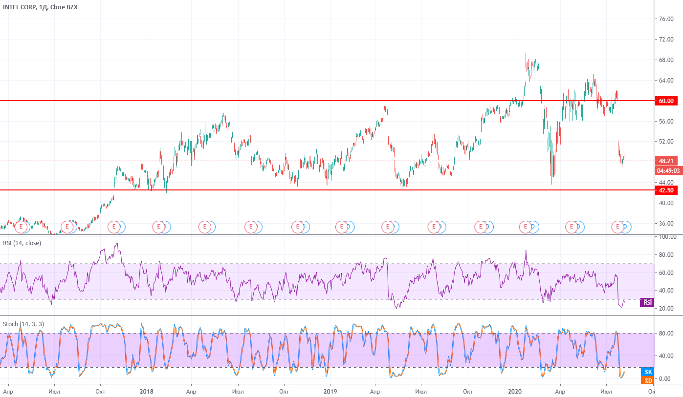 Intel (NASD: INTC) - Крупнейший в мире производитель микропроцессоров. Под контролем компании находится около 95% рынка серверных процессоров, доля процессоров для персональных компьютеров составляет более 80% от рынка. Помимо процессоров, Intel активно разрабатывает решения для облачных технологий, искусственного интеллекта, сетей 5G и интернета вещей.