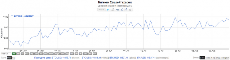 По данным Bitinfocharts хешрейт превышает 133 TH/s, однако исторический максимум на отметке 139,56 TH/s был зафиксирован 25 июля.