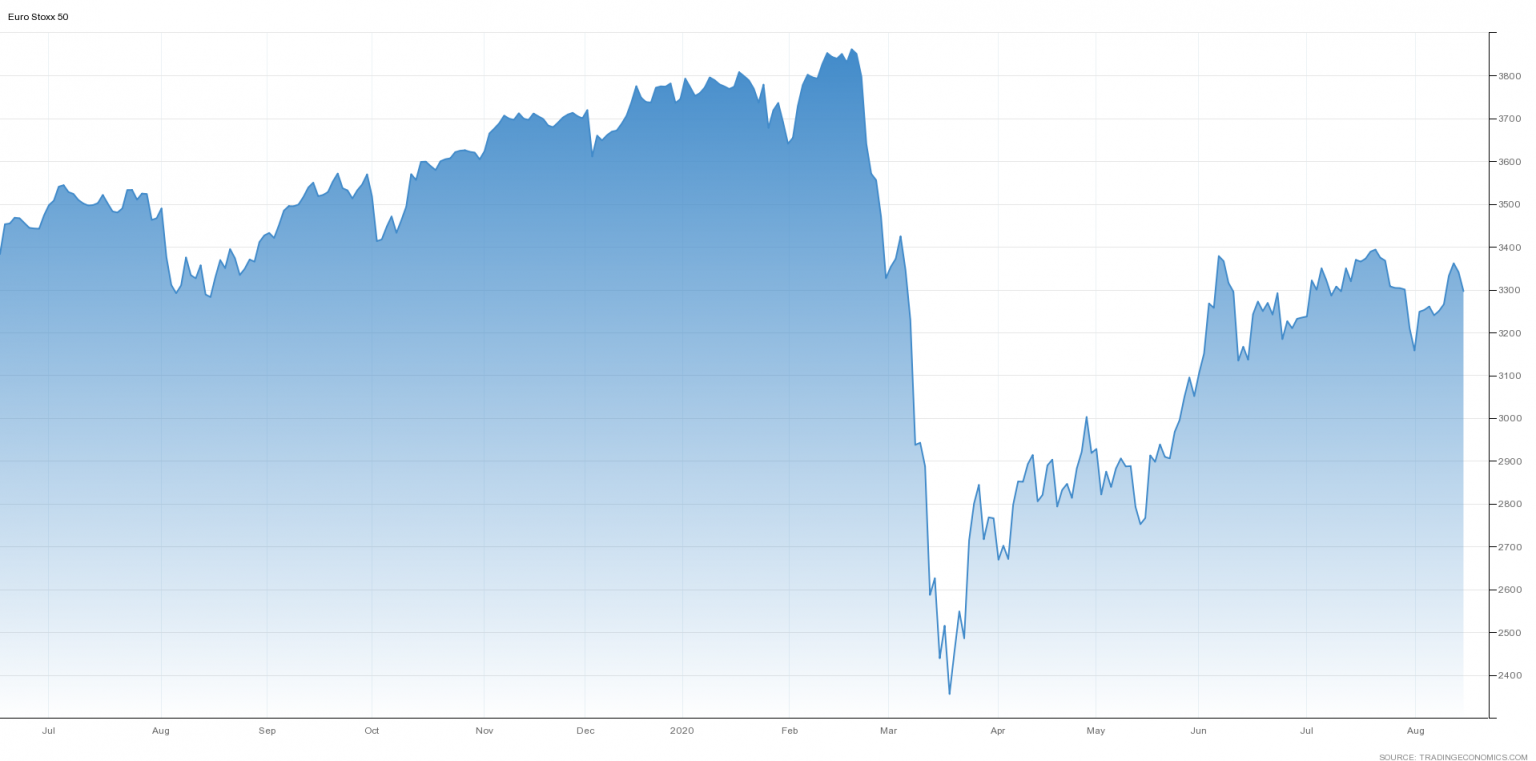 Европейский индекс Euro Stoxx 50 также уверенно восстанавливался после мартовского обвала. Однако, в отличие от Nasdaq 100 и S&P 500, и близко не достиг значений февраля 2020 года.