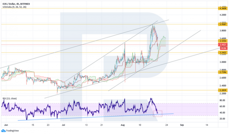 Криптовалюта EOS оттолкнулась от верхней границы восходящего канала, что выступает негативном для быков. Однако цены продолжают держаться на уровне сигнальных линий индикатора Ichimoku Kinko Hyo, это указывает на наличие восходящего импульса.
