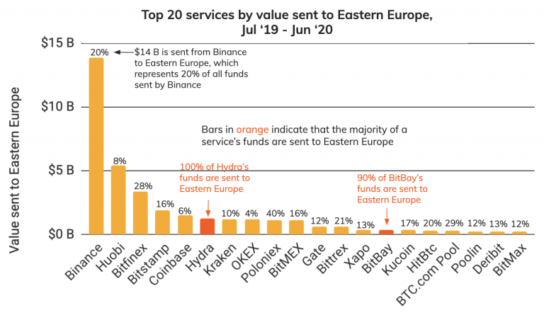 По данным аналитиков, Восточная Европа занимает второе место после Латинской Америки по объему криптовалютных транзакций, отправленных незаконным организациям, — 1,4% от общего объема за 12 месяцев.