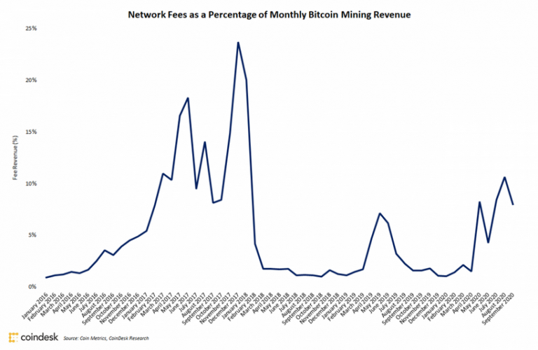 Доля комиссий в доходе майнеров биткоина. Источник: CoinDesk.