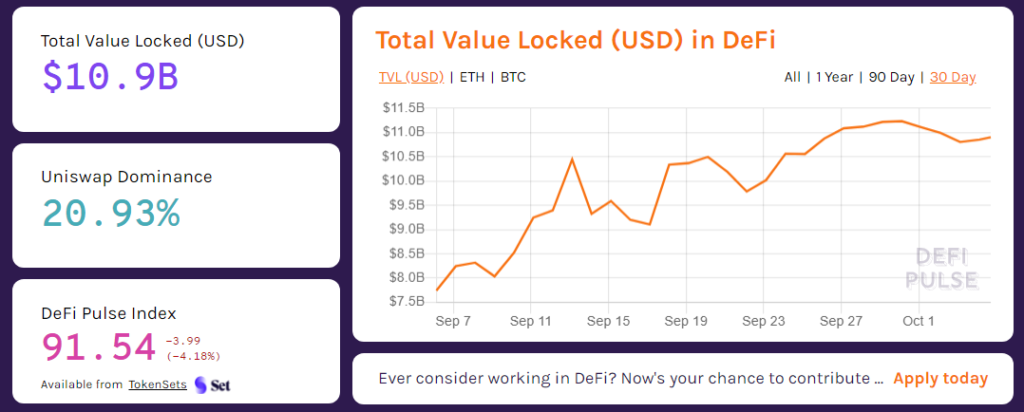 Превысив ранее на этой неделе отметку в $11 млрд, совокупный объем средств, замороженных в DeFi-протоколах по состоянию на вечер воскресенья, 4 октября, находится на уровне в $10,9 млрд.