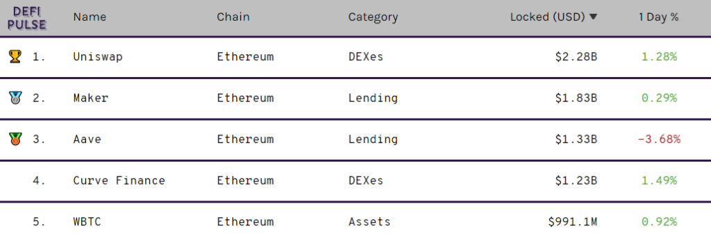 Второе место продолжает удерживать Maker — $1,83 млрд. На третьей строчке Aave с $1,33 млрд. Четвертое место занимает Curve Finance с $1,23млрд, пятое — WBTC с $991,1 млн.