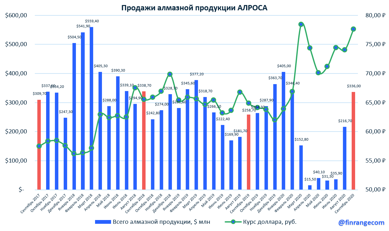 АЛРОСА опубликовала результаты продаж за сентябрь 2020 г. Суммарный объём продаж алмазно-бриллиантовой продукции за прошедший месяц увеличился по сравнению с аналогичным периодом прошлого года на 30% и составил $336 млн, в том числе алмазного сырья – $328,2 млн, бриллиантов − $7,8 млн. Но за 9 мес. 2020 г. общий объём продаж ниже на 35% по сравнению с 9 мес. 2019 г.