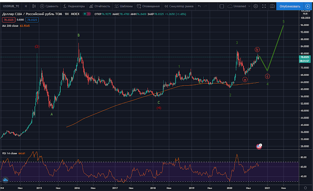 Альтернативный жесткий сценарий: Если на 70 не идём, а сразу пробиваем наверх уровень 81, то разом открывается дорога на 95. А конечная цель смещается выше до 105 рублей за доллар.