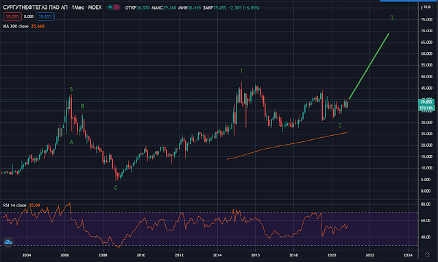 Близок к завершению большой треугольник с 2015 года по привилегированным акциям Сургутнефтегаз и нас ждет мощная волна наверх с целью 80 рублей за акцию, по сути, они могут удвоится в ближайшие 2-3 года. Благодаря росту доллара в этом году, мы можем увидеть рост чистой прибыли компании за 2020 год за счет валютной переоценки и в следующем году дивиденды могут составить 12-15% годовых от текущих цен. Глядя на это инвесторы в панике кинутся скупать "привилегии", что вызовет цепную реакцию и рост котировок. Кроме того, геополитические риски России, приход Байдена и возможный пакет жестких санкций в отношении нашей страны создает перспективы дальнейшего ослабления рубля. Все это позволит Сургуту платить хорошие дивиденды вплоть до 2023 года. Продолжаем удерживать данную квази-облигацию в портфеле.