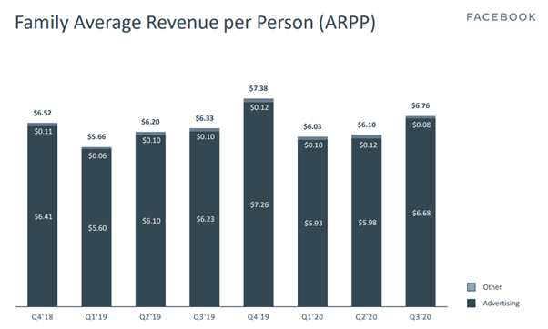Посткарантинный рост. После вакцинации населения рост акций не закончится, так как Alphabet, Facebook значительно увеличат рост рекламной выручки, а Adobe и Salesforce продажи ИТ-продуктов для промышленности и бизнеса. Выручка на одного пользователя стремительно восстанавливалась у Facebook в 3 квартале, когда не было серьезных ограничительных мер. Поэтому при вакцинации населения ждем не только дальнейший прирост пользователей более 12% в год, но и дохода на одного пользователя более 7,5 долларов на человека в квартал.
