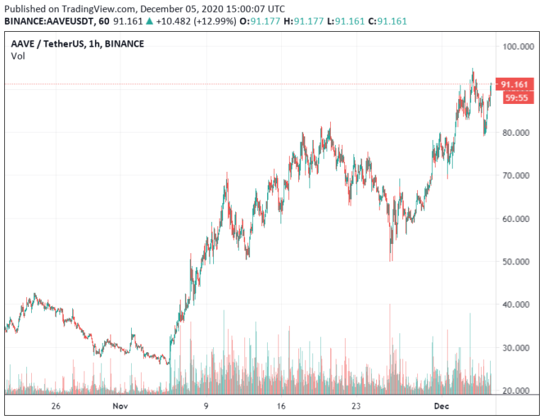 Новость о выходе Aave v2 позитивно сказалась на цене собственного токена проекта — вскоре после релиза его цена взлетела до исторического максимума в $94,26. На момент написания курс Aave скорректировался в район $91, что в любом случае составило почти 50% роста за последнюю неделю.