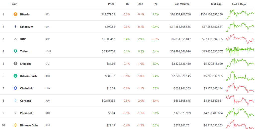 В ходе последовавшей коррекции биткоин опускался ниже $18 200, но на конец недели смог удержать уровень $19 000. Вторая по капитализации криптовалюта опустилась ниже знаковых $600 и на момент написания торгуется рядом с отметкой.