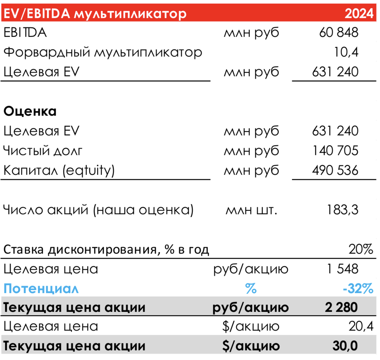 Такие предпосылки дают справедливую оценку, приведенную к текущему моменту с учетом требуемой доходности 20% в год в 20,4$/акцию: