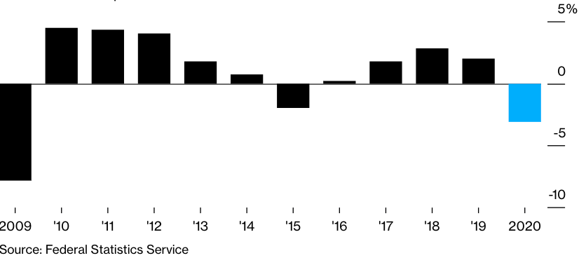 По данным, опубликованным Федеральной службой государственной статистики в понедельник, в минувшем году валовой внутренний продукт сократился на 3.1% — это самое глубокое падение с 2009 года. Однако экономисты, опрошенные Bloomberg, ожидали худших результатов — в среднем падения на 3.7%. Министерство экономики настраивалось на −3.9%.