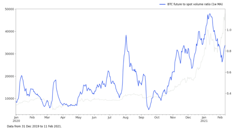 С начала года открытый интерес в биткоин-фьючерсах вырос на 60%. Соотношение объема торгов этими инструментами к соответствующему показателю спотового рынка остается в растущем тренде с октября 2020 года, подчеркнули аналитики.