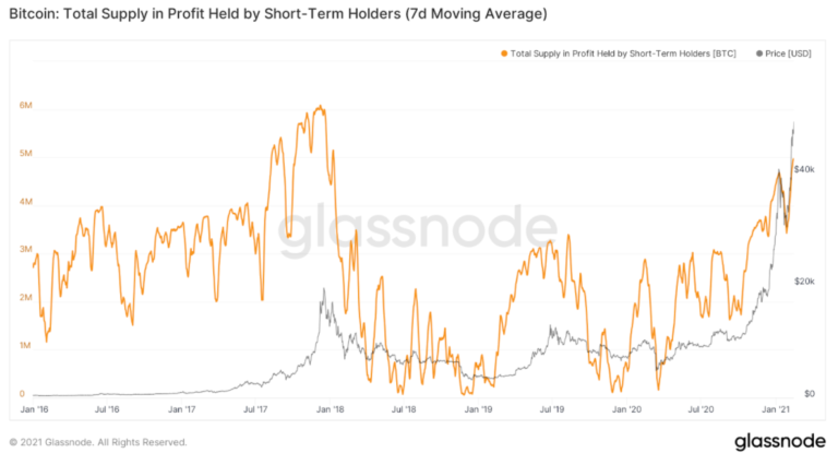 Динамика объема предложения биткоинов в «прибыли», находящийся в распоряжении краткосрочных инвесторов и цены первой криптовалюты. Данные: Glassnode.