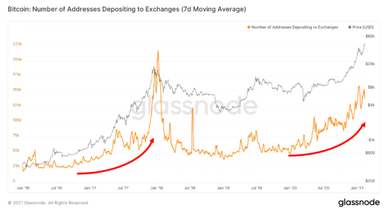 Динамика количества биткоин-адресов, направляющих монеты на централизованные биржи, и цены первой криптовалюты. Данные: Glassnode.