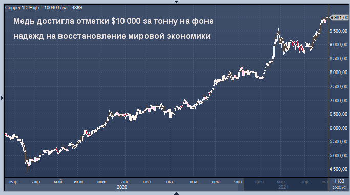 Трехмесячные форвардные контракты на медь на Лондонской бирже металлов выросли в цене на 0,7% до 10 040 долларов, самого высокого уровня с февраля 2011 года, когда контракт достиг рекордной отметки в 10 190 долларов за тонну.