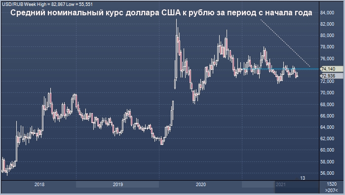 Реальный курс рубля к доллару в августе 2021 года к аналогичному месяцу годом ранее вырос на 0,4%, а к евро — на 0,9%.