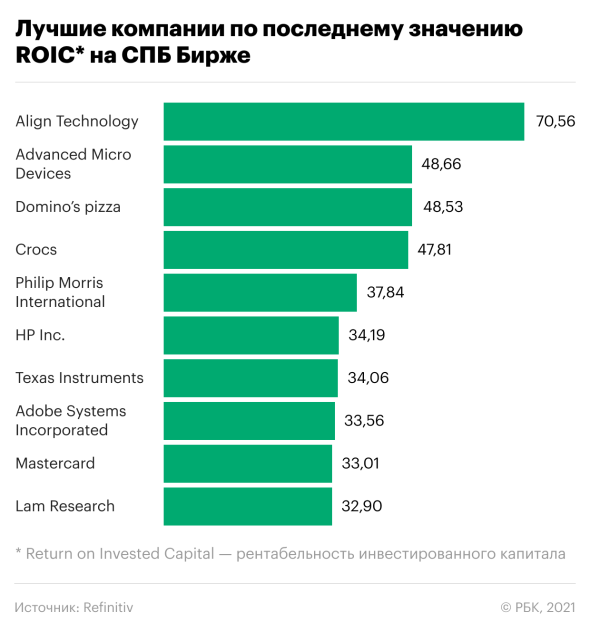 Первое и второе место среди компаний, торгуемых на СПБ Бирже, принадлежат Align Technology и AMD. А на третьем с ROIC 48,53% стоит сеть пиццерий Domino's Pizza.