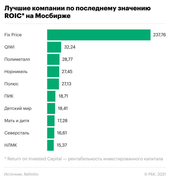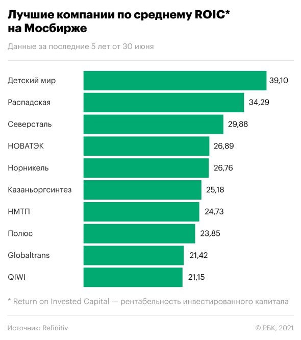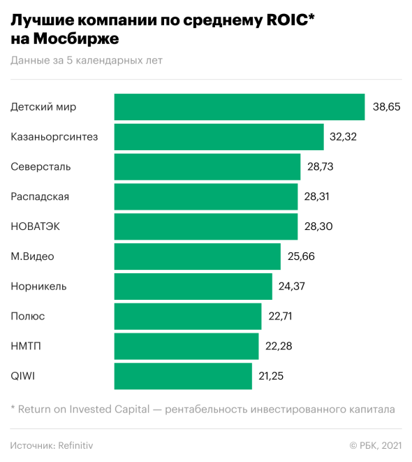На Мосбирже компания с наибольшим ROIC — «Детский мир». Второе и третье места принадлежат российской химической компании «Казаньоргсинтез» (32,32%) и металлургической «Северстали» (28,73%).