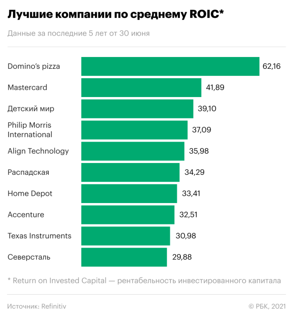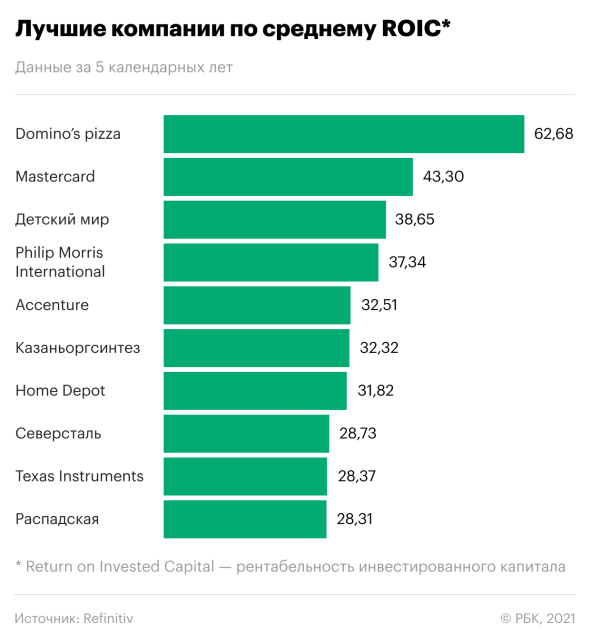 По скользящему показателю ROIC на первых трех местах во всех трех списках вновь оказались Domino's Pizza (62,16%), Mastercard (41,89%) и «Детский мир» (39,1%).
