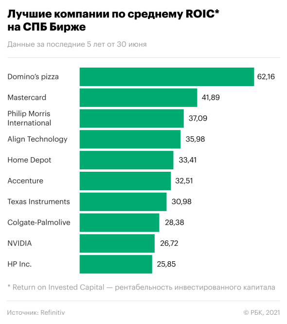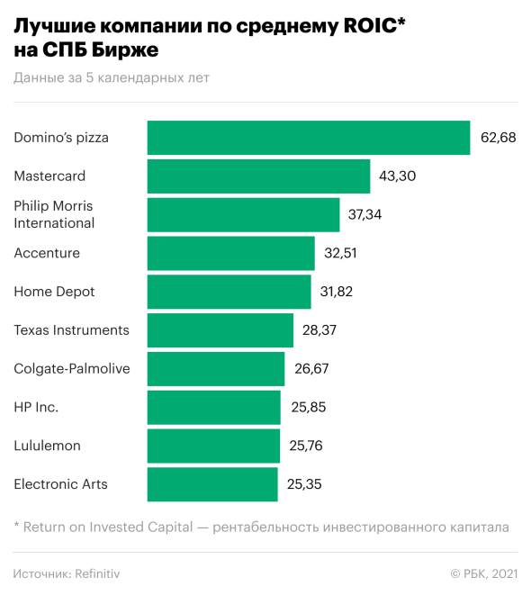 Здесь лидер по доходности на инвестированный капитал в каталоге «РБК Инвестиций» — Domino's Pizza (62,68%). Затем идет международная платежная система Mastercard (43,3%), а на третьем месте — сеть магазинов детской одежды и других товаров для детей «Детский мир» с показателем 38,65%.