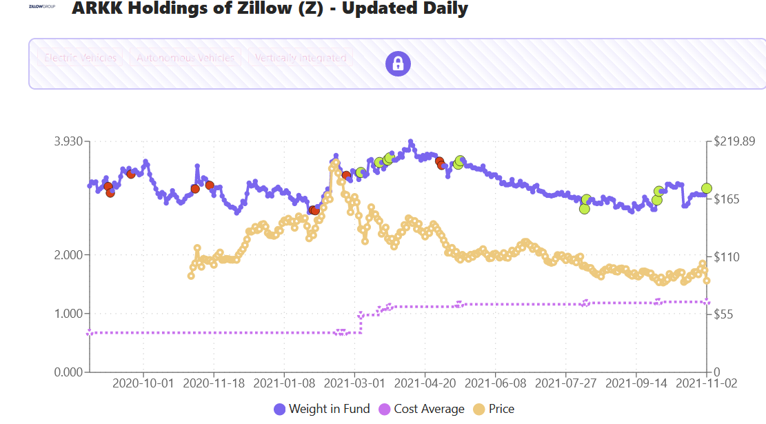 Лучший управляющий фонда всех времен и народов по версии WallStreetBets, Кэти Вуд, очень любит ”Zillow”. Бумага занимает 11 место по весу в ее фонде ARKK; Кэти покупала акции (зеленые кружки на графике) весь второй и третий квартал.
